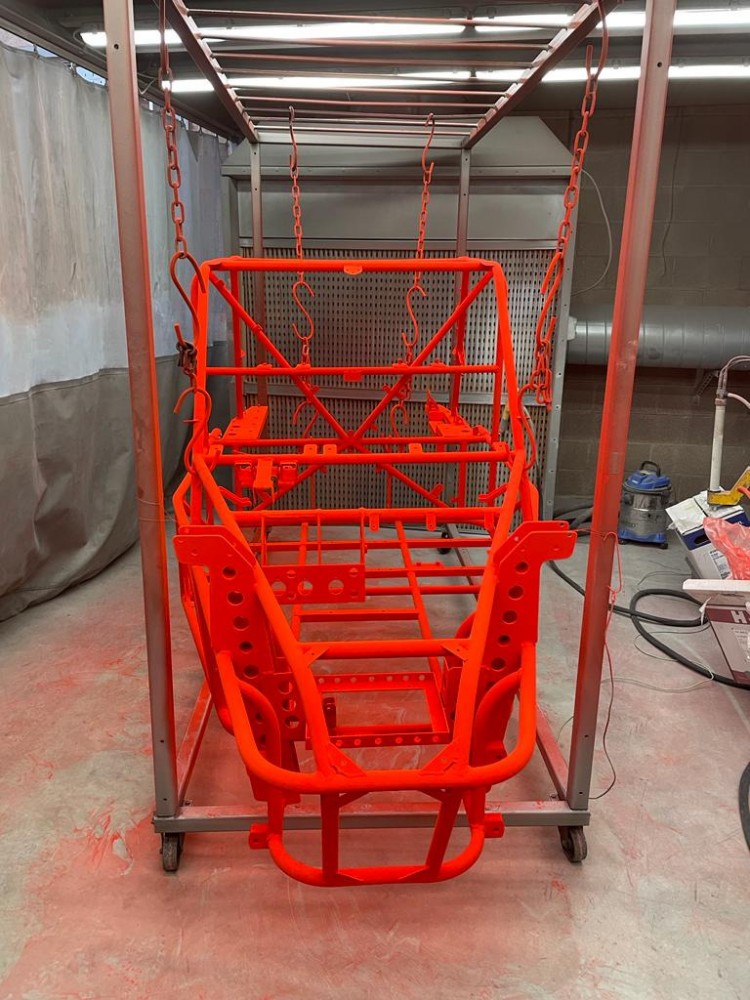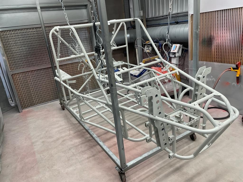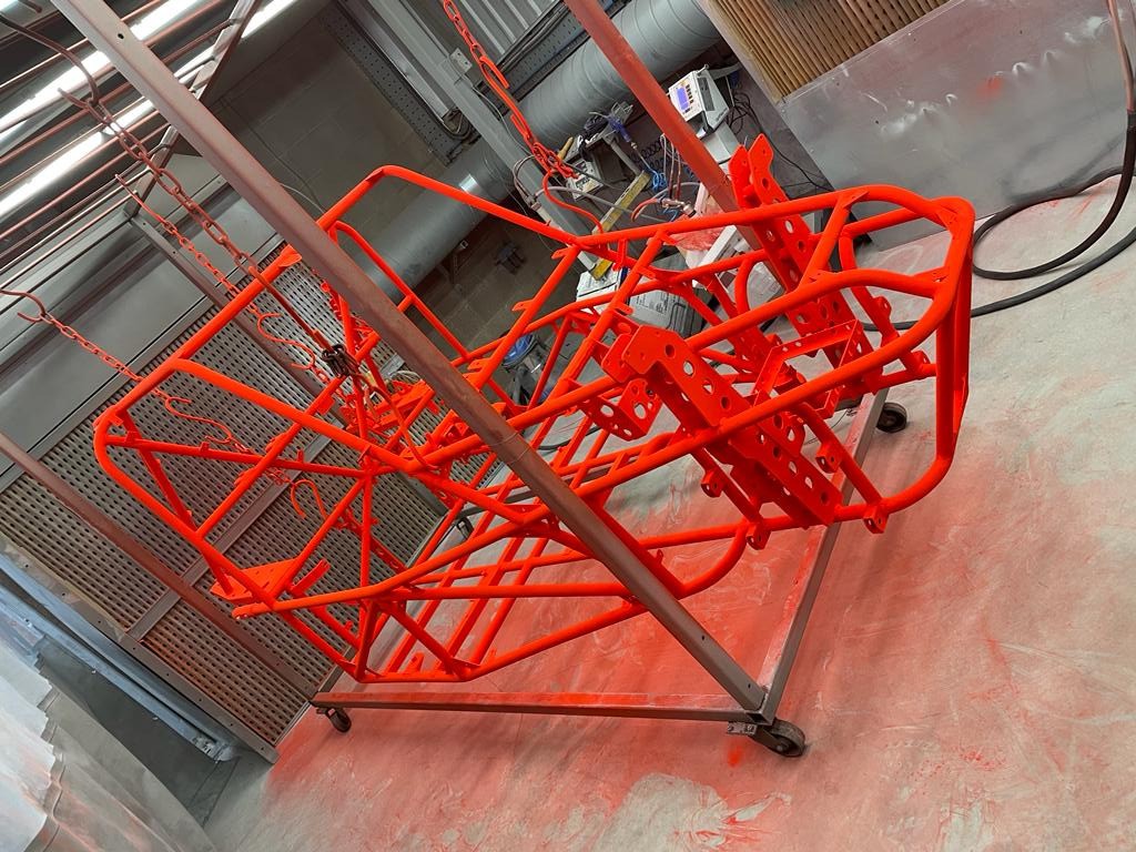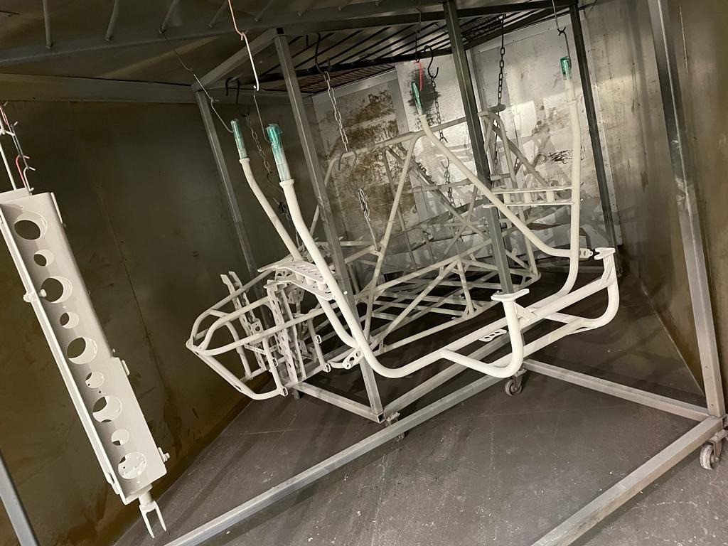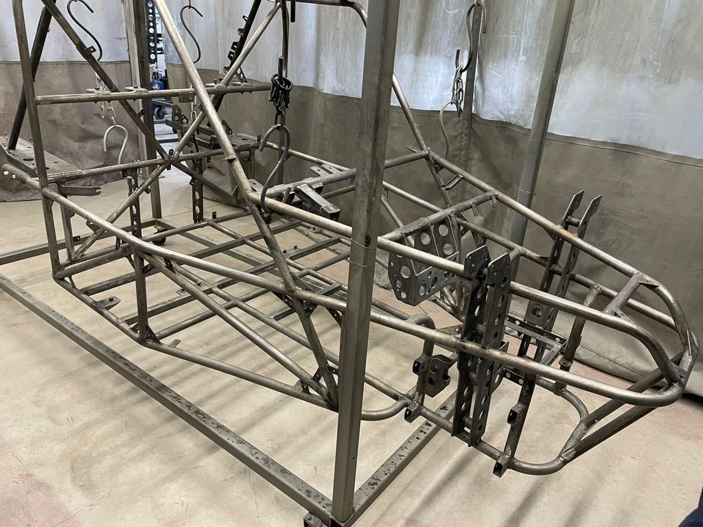 Holes welded up and smoothed off, the next stage was for the Northcoat team to go over the entire frame with a light abrasive pads to make sure everything is smooth and no welding spatter or other rubbish will spoil the final finish, then mount the frame onto the frames for the next stage